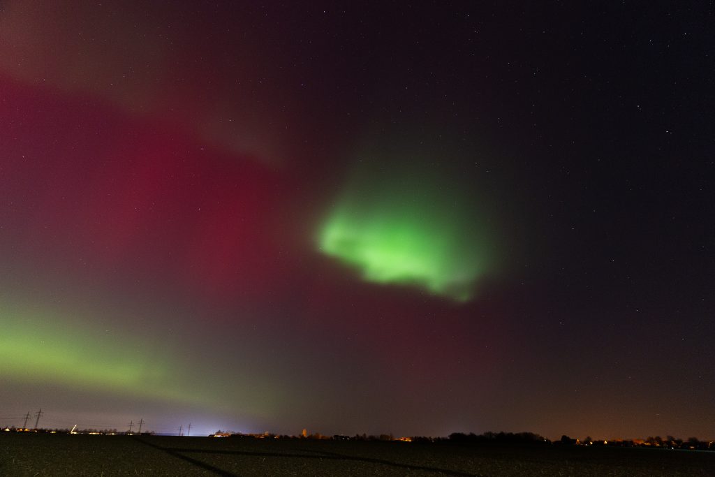 Es gab mal wieder großes Polarlicht bis nach Süddeutschland. Ich konnte hier in Braunschweig zeitweise das Polarlicht auch in südöstlicher Richtung beobachten. Teilweise war der Nordhimmel rot eingefärbt. Das grüne Polarlicht hatte zum Teil das Aussehen von vorbeiziehenden Wolken.