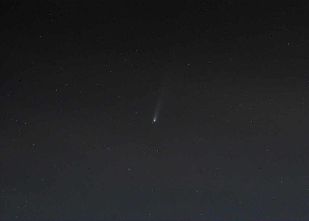 Die Aufnahme zeigt den Kometen bei Azimut 256° und einer Höhe von 11° über dem Horizont in der dunstigen Abenddämmerung.